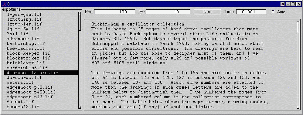 The editor consumes space and time on large patterns, so here is a version which performs all calculations directly on vectors. This version also knows how to read run-length-encoded .lif files and allows the operator to set the time-interval for 'auto' mode: