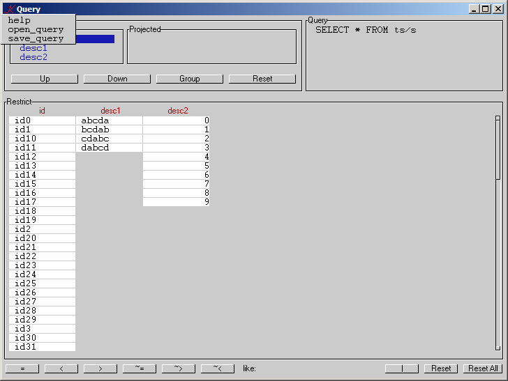 The user should be able to construct the "select <fields> from t" part of a query interactively. Once fields have been selected, the user should be able to specify which of the key fields, if any, the resulting view is to be grouped on. If grouping has been specified, the user should also be able to indicate, for each data field in the view, what aggregation function is to be used.